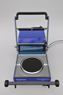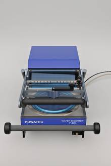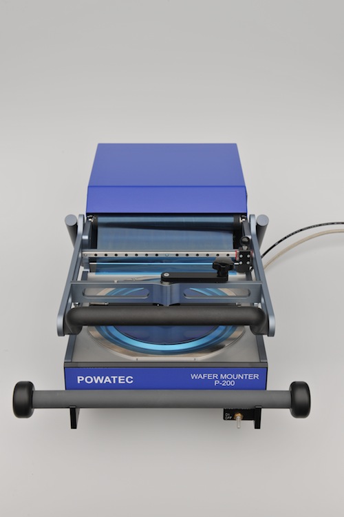 Der POWATEC Wafer Mounter Model P-200 ermöglicht das Aufkleben von Folien auf Wafer / Substrate und den Rahmen (Frame) in einem Durchgang. Der Wafer wird mit Vakuum während des Aufklebevorgangs auf einem antistatischen Feinstgewebe (Carbon) gehalten. Dieses Gewebe schützt die Waferoberfläche während des Aufklebeprozesses und absorbiert allfällige Schmutzpartikel. Mittels einer Gummirolle wird die Folie luftblasenfrei aufgeklebt. Mit der Schneidvorrichtung wird die Folie auf dem Rahmen geschnitten und mit dem Quermesser von der Folienrolle getrennt.